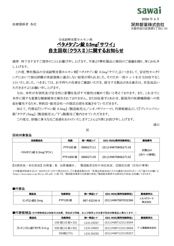 「ベタメタゾン錠0.5mg」一部をロットを自主回収(クラスⅡ)【沢井製薬】