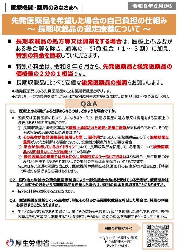 長期収載品の処方等又は調剤に係る選定療養の実施に伴う留意事項については、これまで「長期収載品の処方等又は調剤について」において示してきたが、今般、社会保障審議会医療保険部会や中央社会保険医療協議会での議論、答申を経て、令和8年3月27日に「厚生労働大臣の定める評価療養、患者申出療養及び選定療養等の一部を改正する告示」が告示され、同年6月1日から適用されることとされたことに伴い、留意事項通知を改正することとしたので、保険医療機関・薬局、審査支払機関等に対し周知徹底を依頼した。