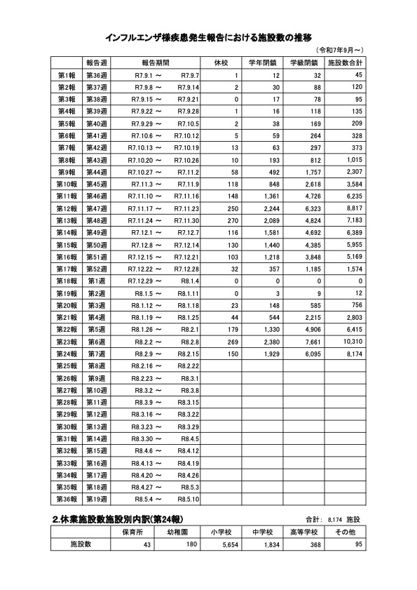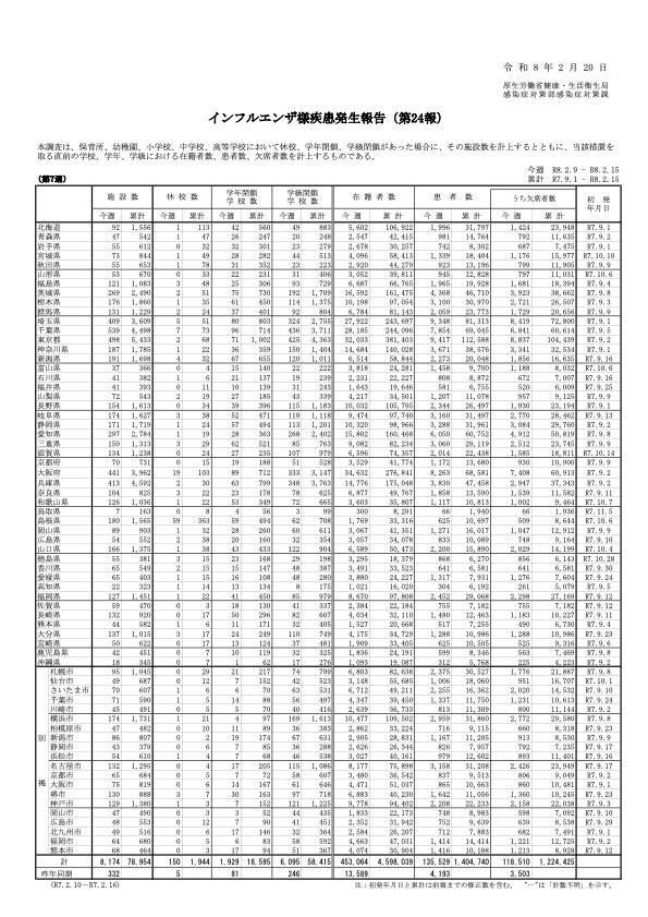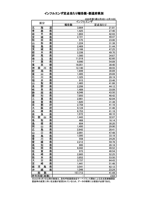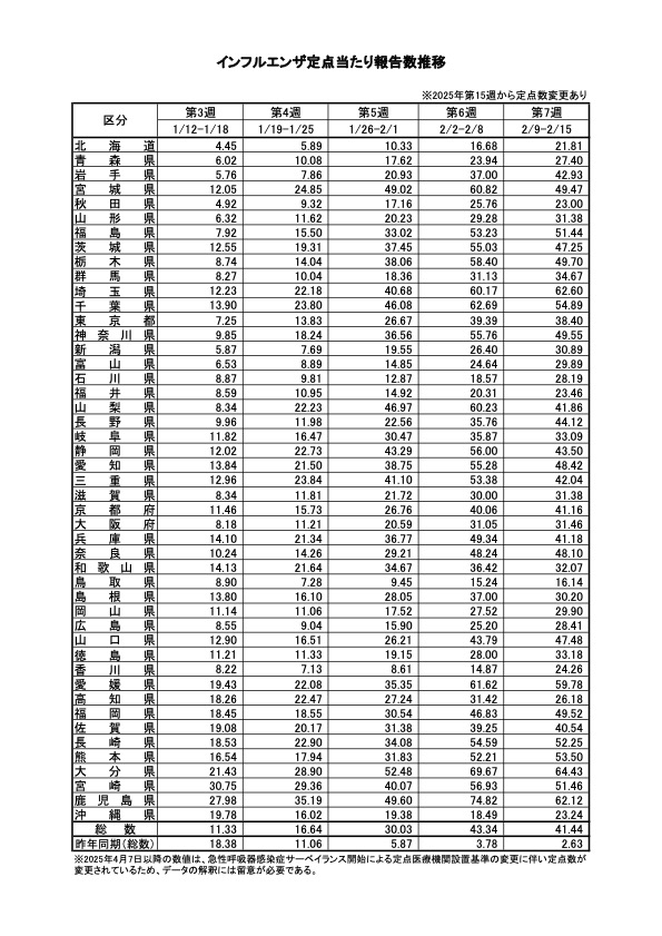厚生労働省は2月20日、令和8年第7週(令和8年2月9日から令和8年2月15日まで)分のインフルエンザの発生状況を、取りまとめ公表した。