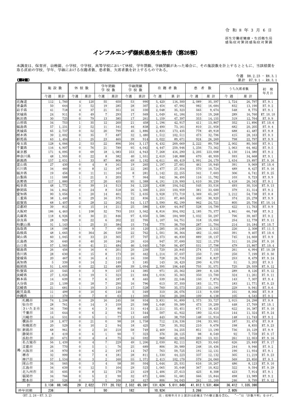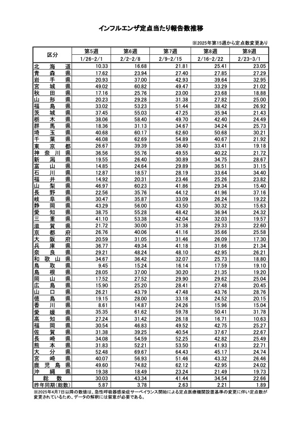 厚生労働省は3月6日、令和8年第9週(令和8年2月23日から令和8年3月1日まで)分のインフルエンザの発生状況を、取りまとめ公表した。