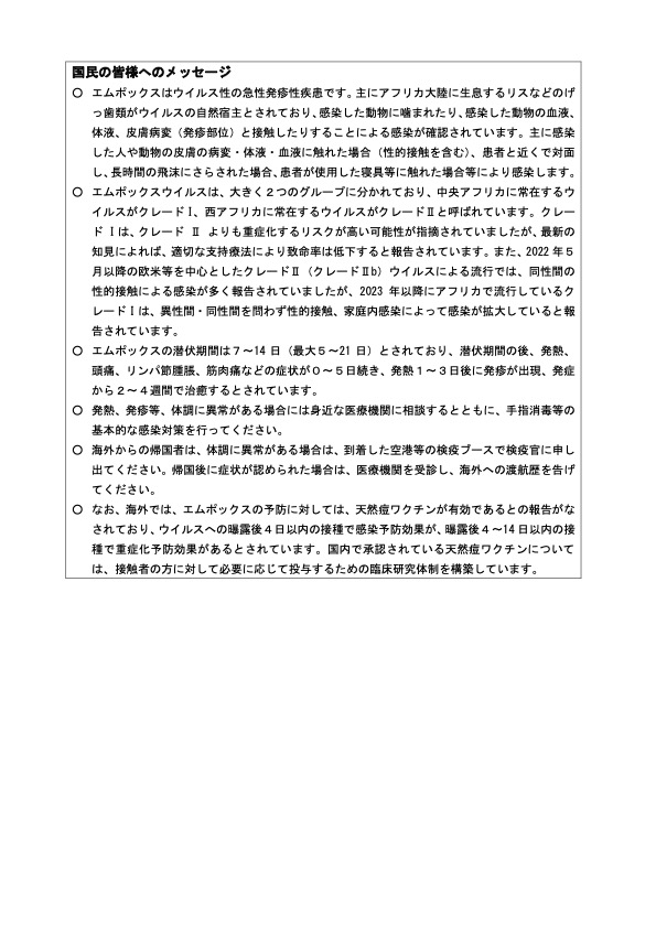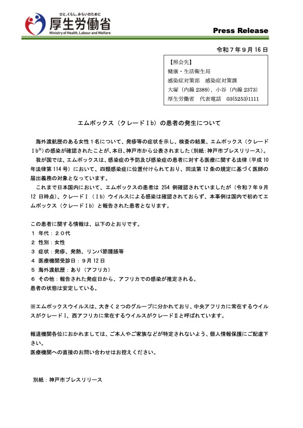 厚生労働省は9月16日、エムポックス(クレードⅠb)の感染が確認されたことを公表した。
