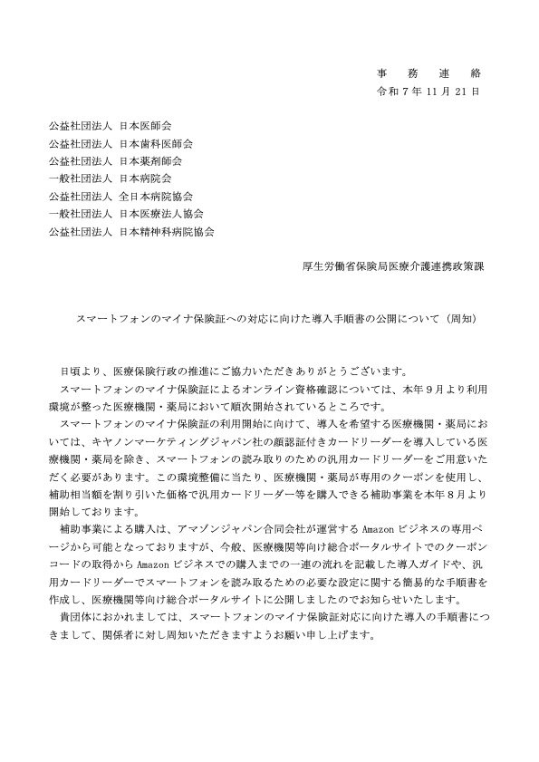 厚生労働省は11月21日、「スマートフォンのマイナ保険証への対応に向けた導入手順書の公開について(周知)」とする事務連絡を発出した。