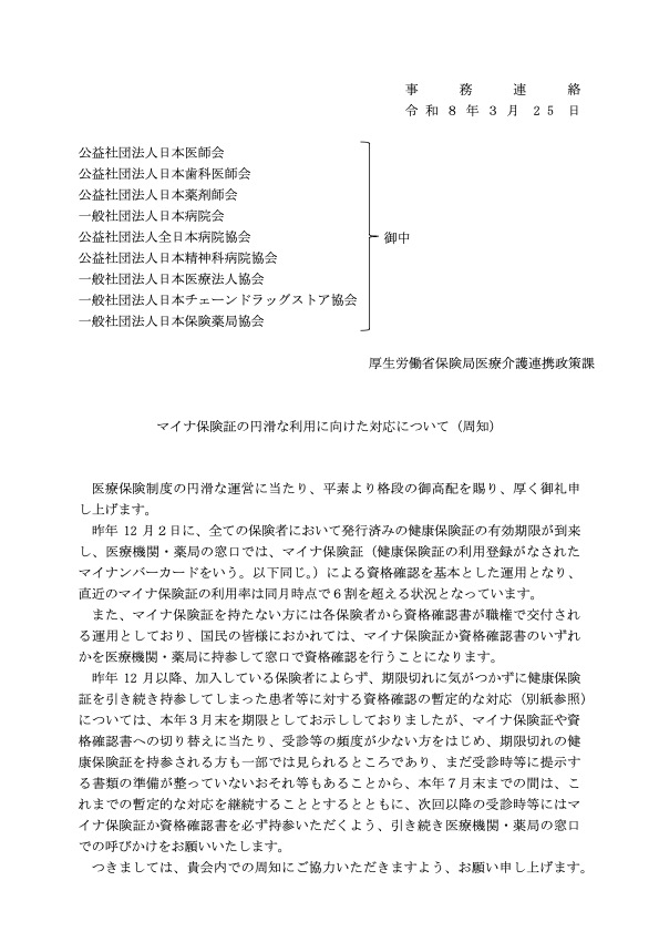 厚生労働省は3月25日、「マイナ保険証の円滑な利用に向けた対応について(周知)」とする事務連絡を発出した。