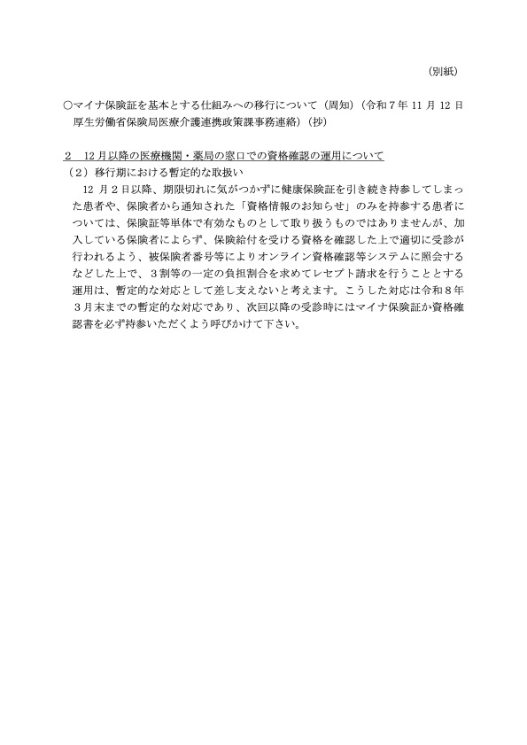 昨年12月以降、加入している保険者によらず、期限切れに気がつかずに健康保険証を引き続き持参してしまった患者等に対する資格確認の暫定的な対応については、本年3月末を期限として示していたが、マイナ保険証や資格確認書への切り替えに当たり、受診等の頻度が少ない方をはじめ、期限切れの健康保険証を持参される方も一部では見られるところであり、まだ受診時等に提示する書類の準備が整っていないおそれ等もあることから、本年7月末までの間は、これまでの暫定的な対応を継続することとするとともに、次回以降の受診時等にはマイナ保険証か資格確認書を必ず持参いただくよう、引き続き医療機関・薬局の窓口での呼びかけを依頼した。