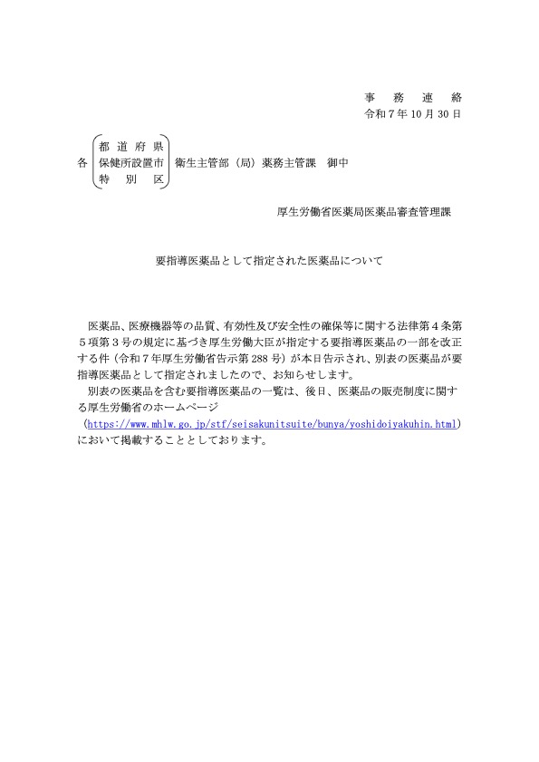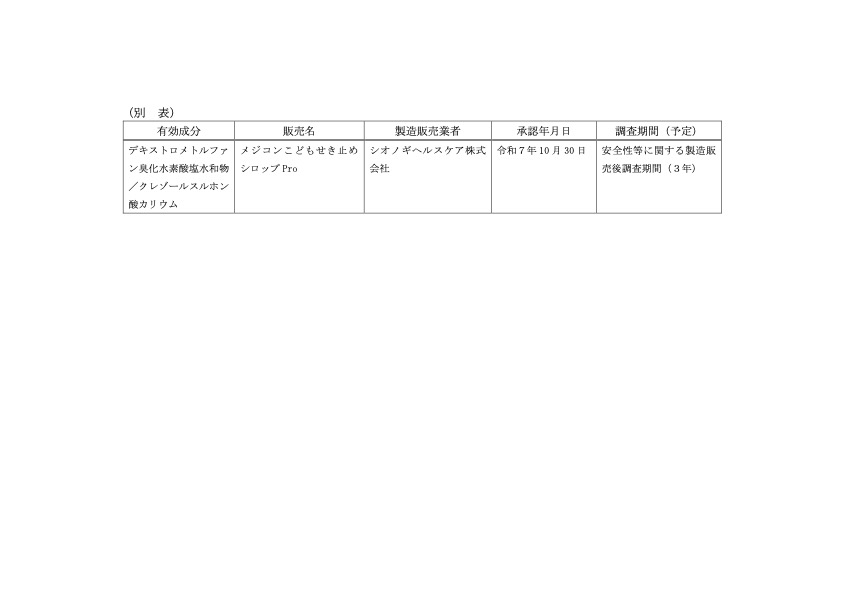 厚生労働省は10月30日、「要指導医薬品として指定された医薬品について」とする事務連絡を発出し、「メジコンこどもせき止めシロップPro」(有効成分:デキストロメトルファン臭化水素酸塩水和物/クレゾールスルホン酸カリウム)について、要指導医薬品として指定されたと告示した。