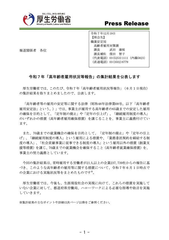 厚生労働省は12月19日、令和7年「高年齢者雇用状況等報告」の集計結果を公表した。