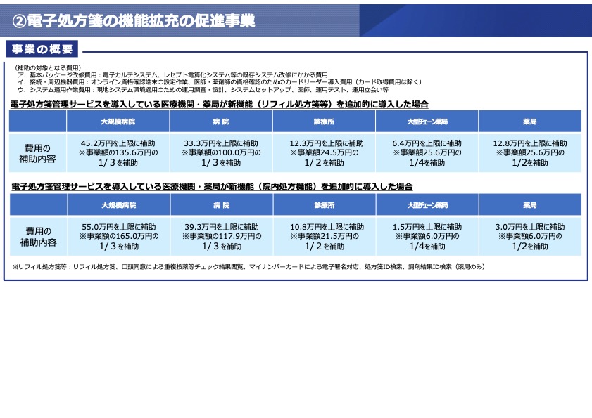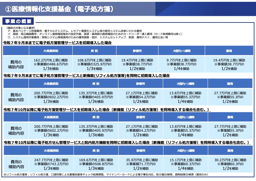 令和7年10月以降の医療情報化支援基金(ICT基金)による電子処方箋の導入補助について、補助対象とする導入期限を令和8年9月まで延長した上で、令和7年10月以降に導入した施設に対しても補助を実施することとした。また、補助対象の機能について、従来の院外処方機能に加えて院内処方機能も補助対象に追加することとしている。なお、令和8年10月以降の補助の取扱いについては、令和8年夏までにとりまとめられる電子カルテ/共有サービスの普及計画を踏まえて、電子処方箋と電子カルテ/共有サービスが一体的に導入が進むよう、改めて補助の取扱いを検討することとしている。ただし、薬局については、現時点において概ねすべての薬局に導入されることが見込まれていることから、補助対象とする導入期限としては令和8年9月までの延長を最後とし、未導入薬局に対しては導入期限までの導入を促していくこととしている。