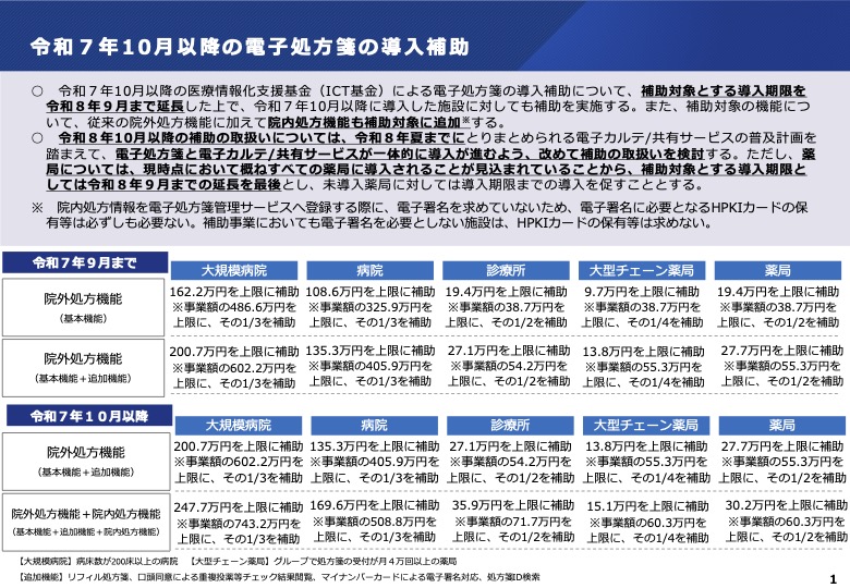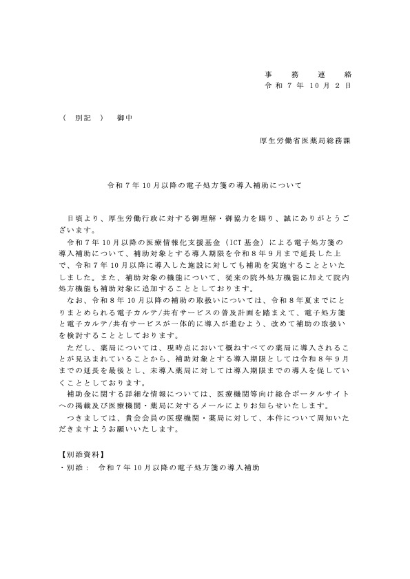 厚生労働省は10月2日、「令和7年10月以降の電子処方箋の導入補助について」とする事務連絡を発出した。