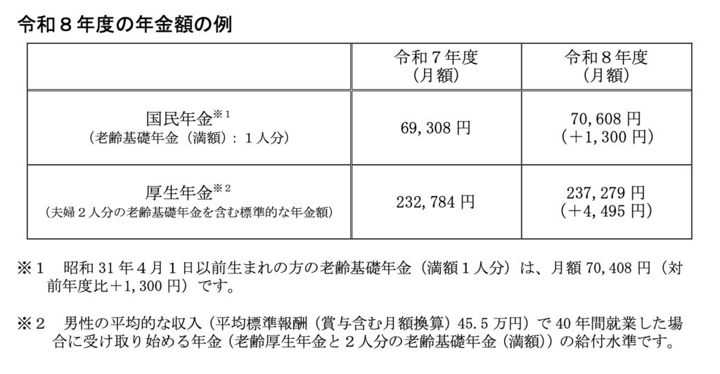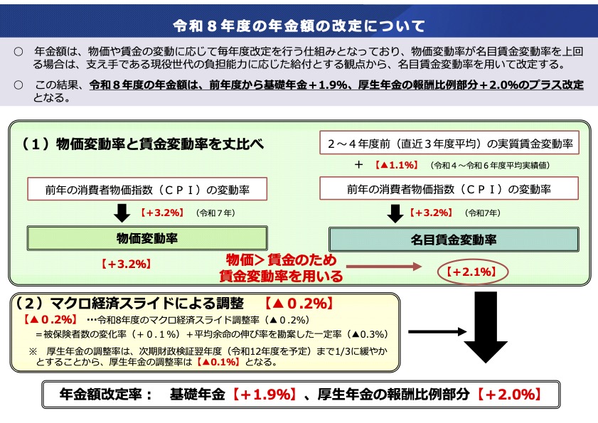 これを踏まえ、令和8年度の年金額は、法律の規定に基づき、令和7年度から国民年金(基礎年金)が1.9%の引上げ、厚生年金(報酬比例部分)が2.0%の引上げとなる。