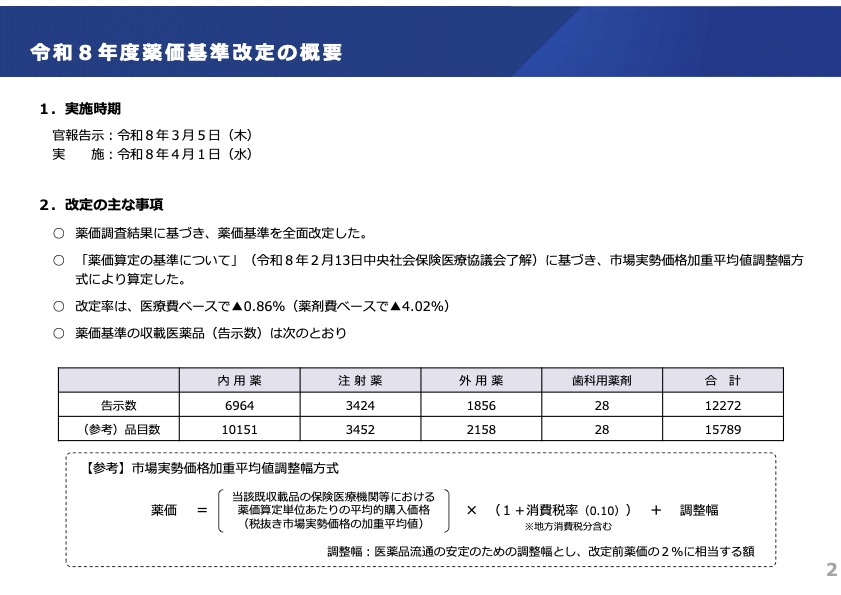 厚生労働省は3月5日、令和8年度薬価基準改定を官報に告示した。実施は令和8年4月1日となる。