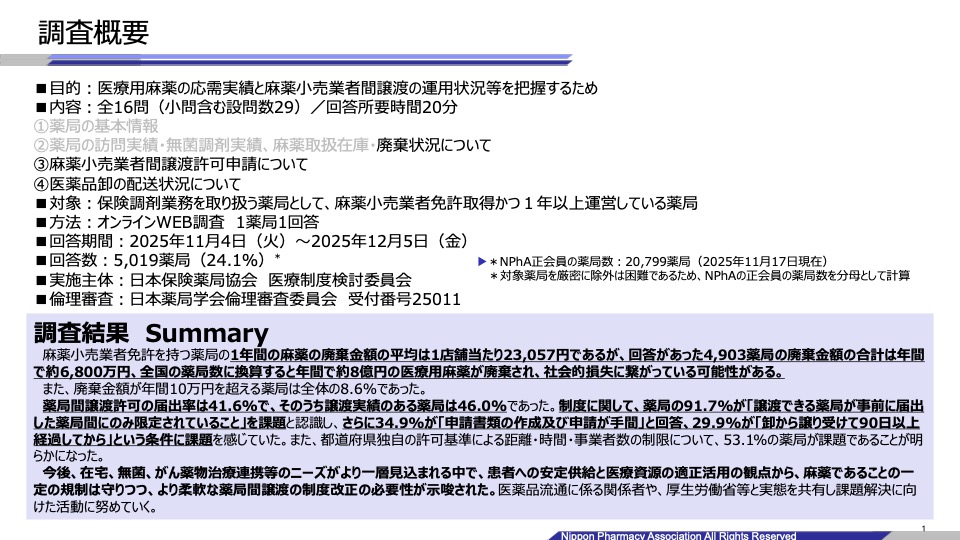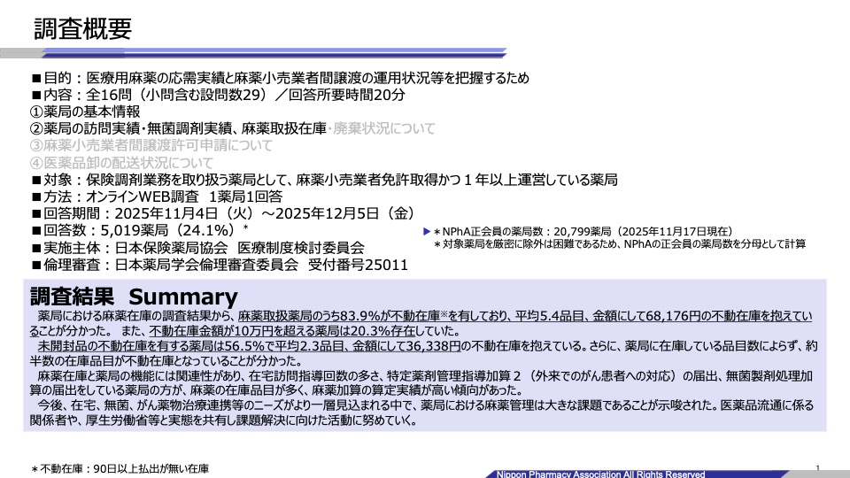 日本保険薬局協会(NPhA)は2月16日、医療用麻薬の在庫・廃棄および薬局間譲渡の実態を把握するため、全国5,019薬局を対象に調査を実施し公表した。
