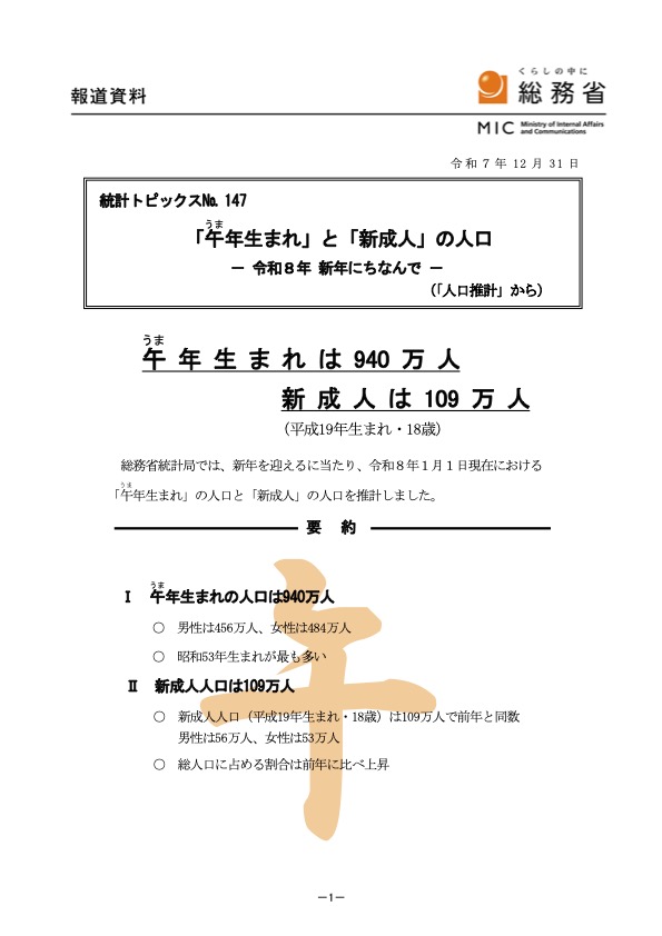 総務省統計局は12月31日、新年を迎えるに当たり、令和8年1月1日現在における「午年生まれ」の人口と「新成人」の人口を推計し公表した。