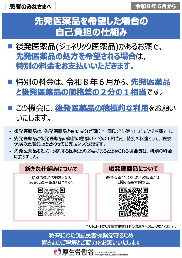 後発医薬品(ジェネリック医薬品)があるお薬で、先発医薬品の処方を希望される場合は、特別の料金をお支払いいただきます。