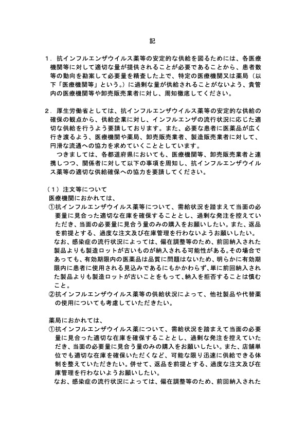 2. 厚生労働省は、抗インフルエンザウイルス薬等の安定的な供給の確保の観点から、供給企業に対し、インフルエンザの流行状況に応じた適切な供給を行うよう要請し、また、必要な患者に医薬品が広く行き渡るよう、医療機関や薬局、卸売販売業者、製造販売業者に対して、円滑な流通への協力を求めていく。