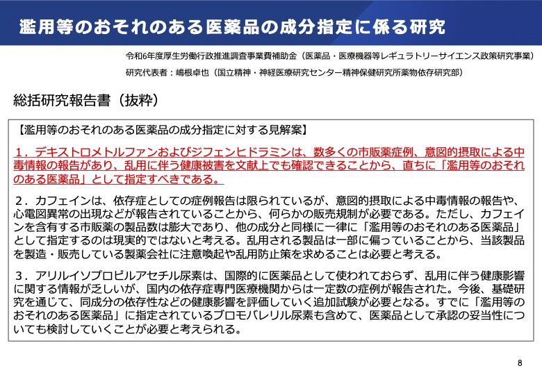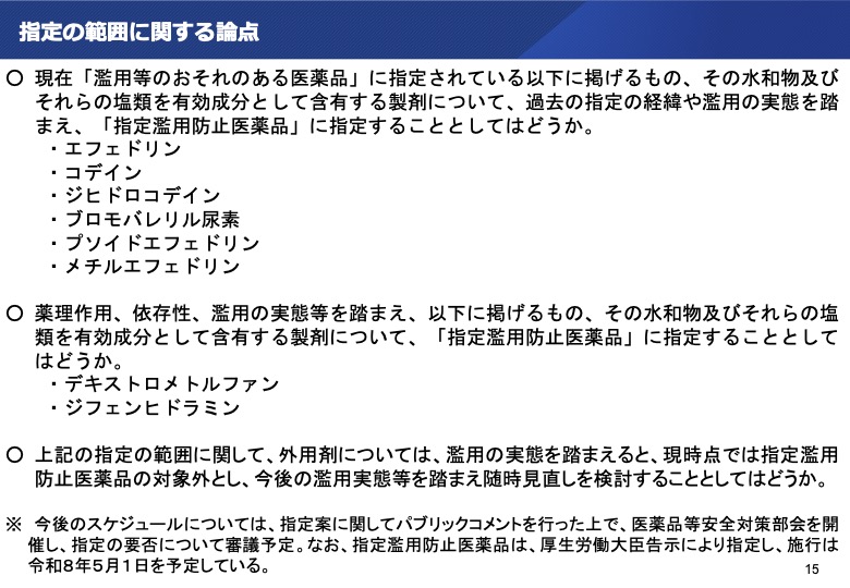厚生労働省は11月11日、薬事審議会・医薬品等安全対策部会安全対策調査会を開催し、令和8年5月施行の法改正による改正後の規定(指定濫用防止医薬品)に指定する成分案を提示した。