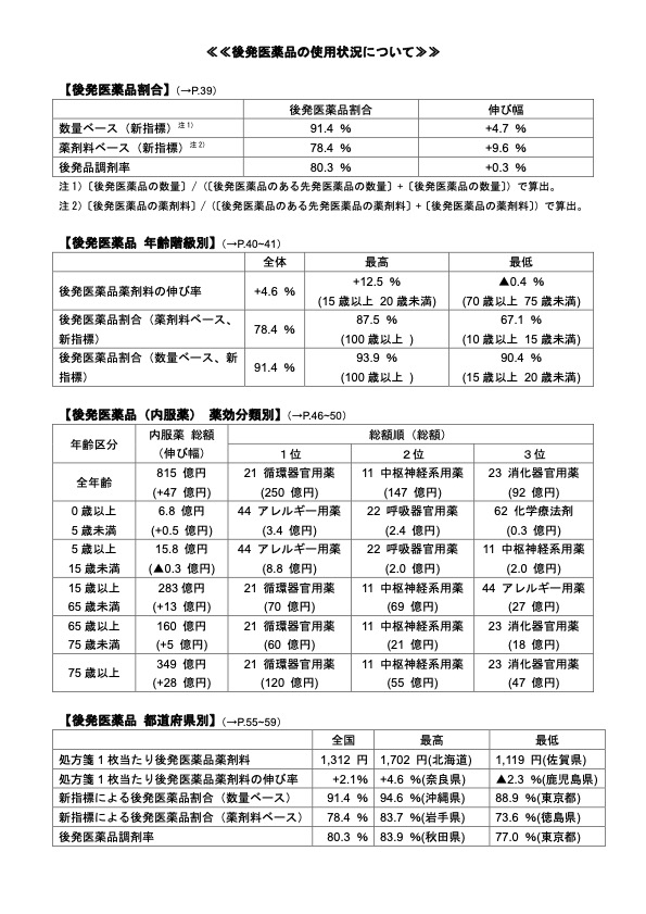 調剤医療費の内訳は、技術料が1,929億円(伸び率+6.2%)、薬剤料が5,235億円(伸び率+7.9%)、薬剤料のうち、後発医薬品が948億円(伸び率+4.6%)であった。 - 薬剤料の多くを占める内服薬の処方箋1枚当たり薬剤料5,579円(伸び率+4.1%)を、処方箋1枚当たり薬剤種類数、1種類当たり投薬日数、1種類1日当たり薬剤料の3要素に分解すると、各々2.79 種類(伸び率+0.0%)、28.6 日(伸び率+3.0%)、70 円(伸び率+1.1%)であった。