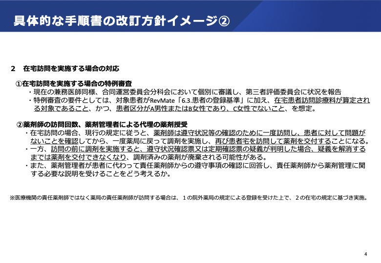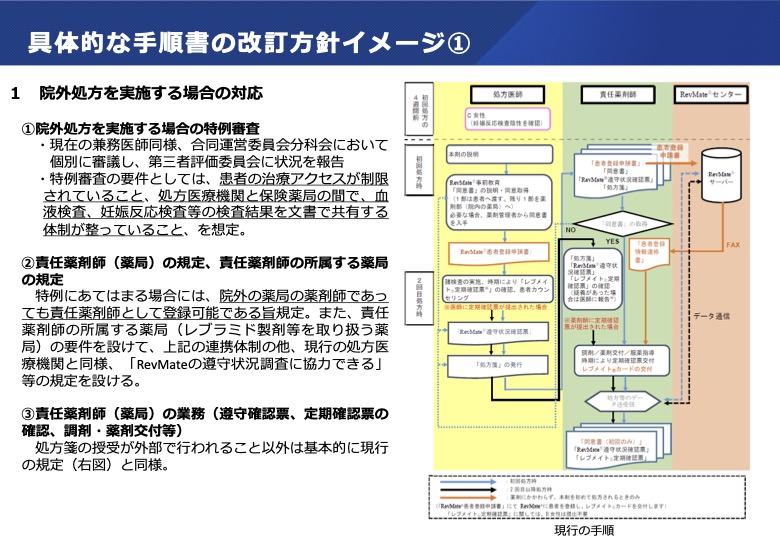 - サリドマイド関連製剤については、TERMS及びRevMateの安全管理手順において、医療機関内での受診、処方、薬剤交付等を前提にしており、サリドマイド関連製剤を服用中の患者が在宅医療を受けることになった場合の取扱い(患者宅等で実施すべき事項等)が明確になっていない。