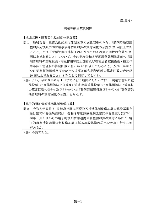 - 令和8年5月 31 日時点で既に医療DX推進体制整備加算の施設基準を 届け出ている保険薬局は、令和8年度診療報酬改定に係る見直しに伴い、 同年6月1日からの電子的調剤情報連携体制整備加算の算定にあたり、電 子的調剤情報連携体制整備加算に係る施設基準の届出を改めて行う必要 があるか。