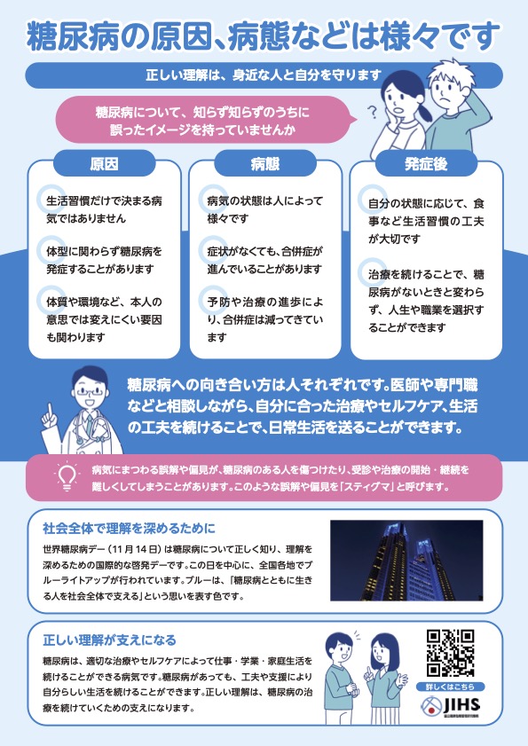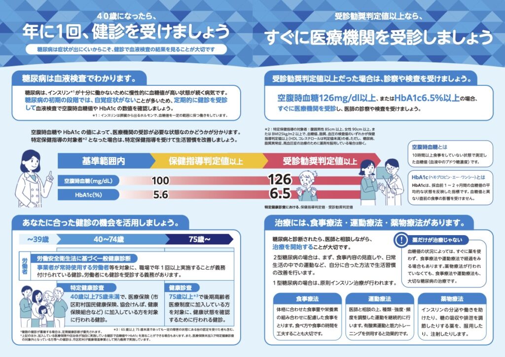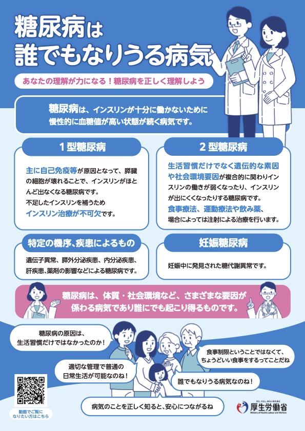 糖尿病に関する普及啓発資材「糖尿病は誰でもなりうる病気」のリーフレットと動画を掲載。