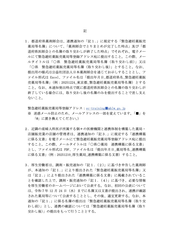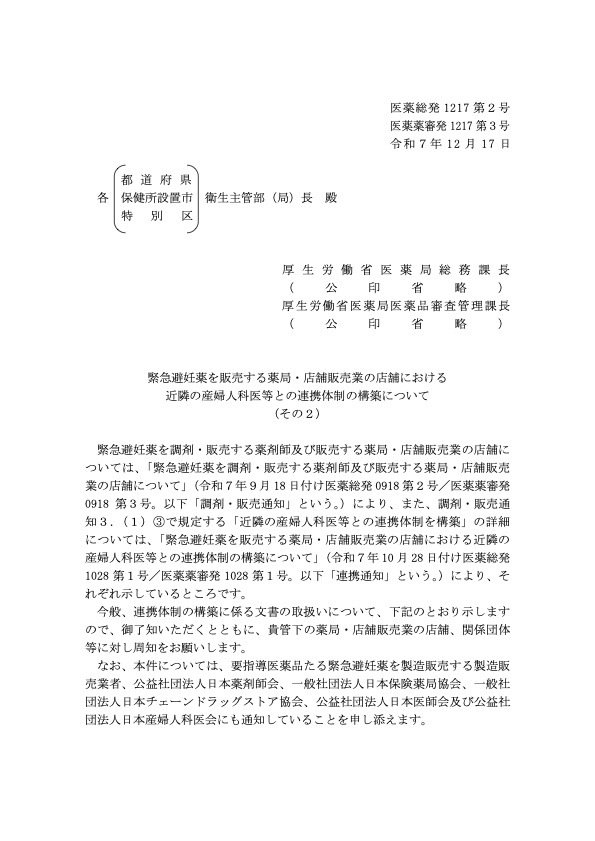 厚生労働省は12月17日、「緊急避妊薬を販売する薬局・店舗販売業の店舗における 近隣の産婦人科医等との連携体制の構築について(その2)」とする事務連絡を発出した。