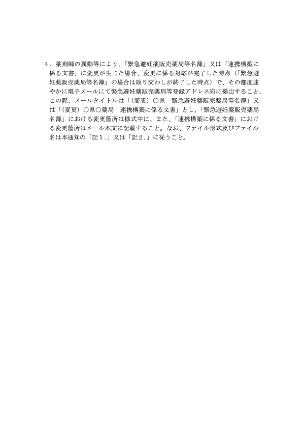 緊急避妊薬を調剤・販売する薬剤師及び販売する薬局・店舗販売業の店舗については、「緊急避妊薬を調剤・販売する薬剤師及び販売する薬局・店舗販売業の店舗について」により、また、調剤・販売通知3.(1)③で規定する「近隣の産婦人科医等との連携体制を構築」の詳細については、「緊急避妊薬を販売する薬局・店舗販売業の店舗における近隣の産婦人科医等との連携体制の構築について」により、それぞれ示している。
