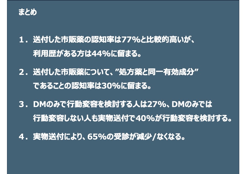 - 通院歴のある花粉症患者に対して、医師から処方された医療用医薬品と同一有効成分のOTC医薬品をお試しいただき、その認識や心境の変化について調査を実施した