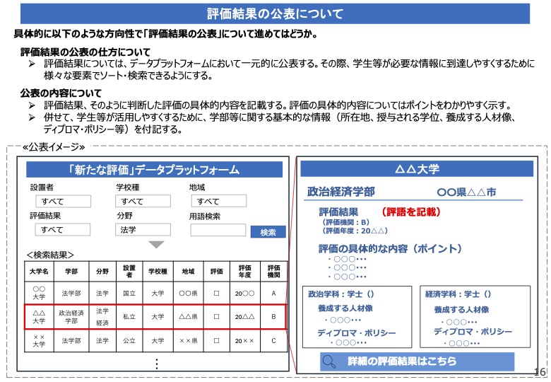 - 評価結果の公表は「新たな評価」データプラットフォームにおいて、わかりやすく、かつ比較可能な形で示してはどうか。