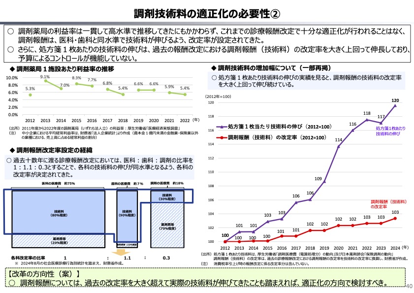 調剤報酬については、過去の改定率を大きく超えて実際の技術料が伸びてきたことも踏まえれば、適正化の方向で検討すべき。