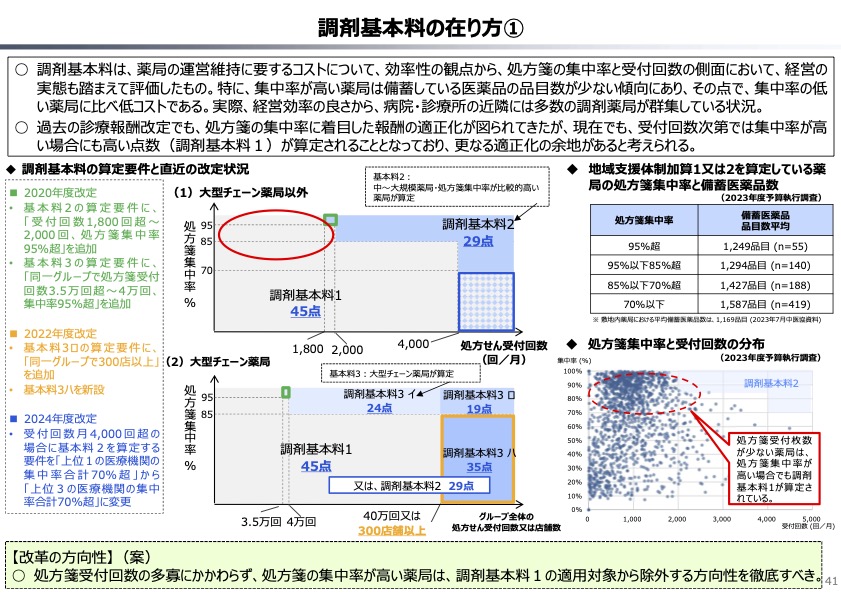 調剤基本料は、薬局の運営維持に要するコストについて、効率性の観点から、処方箋の集中率と受付回数の側面において、経営の実態も踏まえて評価したもの。特に、集中率が高い薬局は備蓄している医薬品の品目数が少ない傾向にあり、その点で、集中率の低い薬局に比べ低コストである。実際、経営効率の良さから、病院・診療所の近隣には多数の調剤薬局が群集している状況。