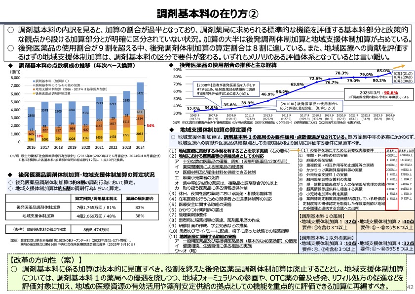 調剤基本料の内訳を見ると、加算の割合が過半となっており、調剤薬局に求められる標準的な機能を評価する基本料部分と政策的な観点から設ける加算部分とが明確に区分されていない状況。加算の大半は後発調剤体制加算と地域支援体制加算が占めている。