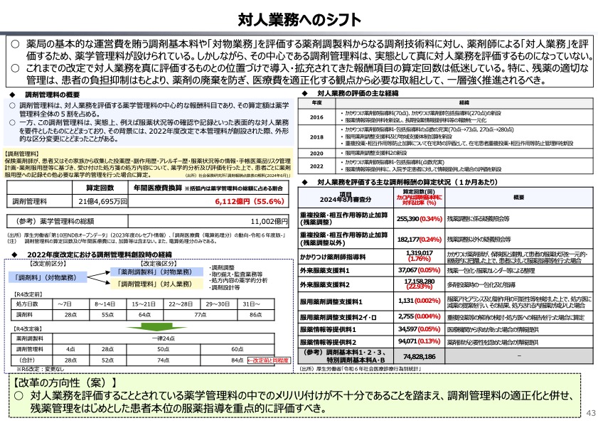 薬局の基本的な運営費を賄う調剤基本料や「対物業務」を評価する薬剤調製料からなる調剤技術料に対し、薬剤師による「対人業務」を評価するため、薬学管理料が設けられている。しかしながら、その中心である調剤管理料は、実態として真に対人業務を評価するものになっていない。