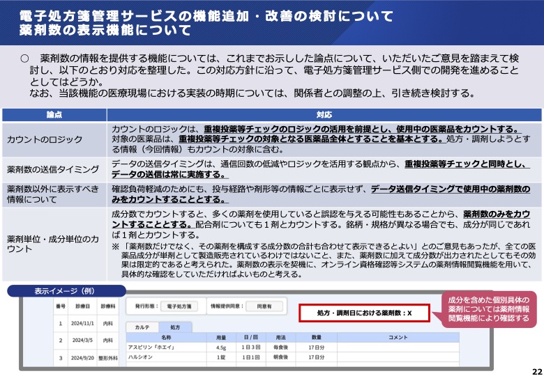 • 薬剤数の情報を提供する機能については、これまでお示しした論点について、いただいたご意見を踏まえて検討し、以下のとおり対応を整理した。この対応方針に沿って、電子処方箋管理サービス側での開発を進めることとしてはどうか。