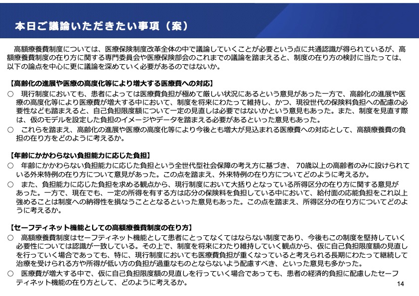- 高額療養費制度はセーフティネット機能として患者にとってなくてはならない制度であり、今後もこの制度を堅持していく必要性については認識が一致している。特に、長期にわたって継続して治療を受けられる方や所得が低い方の負担が過重なものとならないよう配慮すべき。
