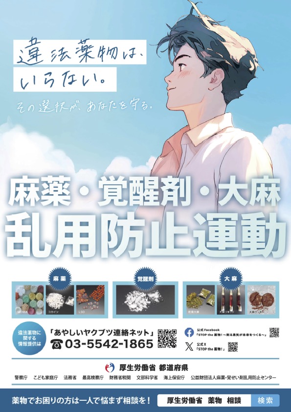 厚生労働省は、都道府県と共催して、10月1日(水)から11月30日(日)までの2か月間、「麻薬・覚醒剤・大麻乱用防止運動」を実施する。