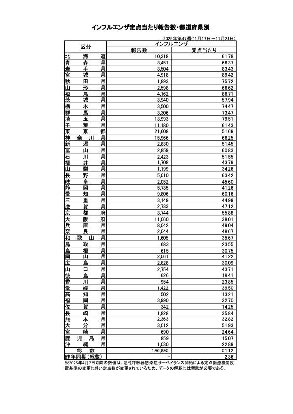 厚生労働省は11月28日、令和7年第47週(令和7年11月10日から令和7年11月16日まで)分のインフルエンザの発生状況を、取りまとめまとめ公表した。