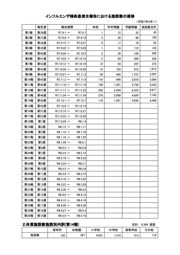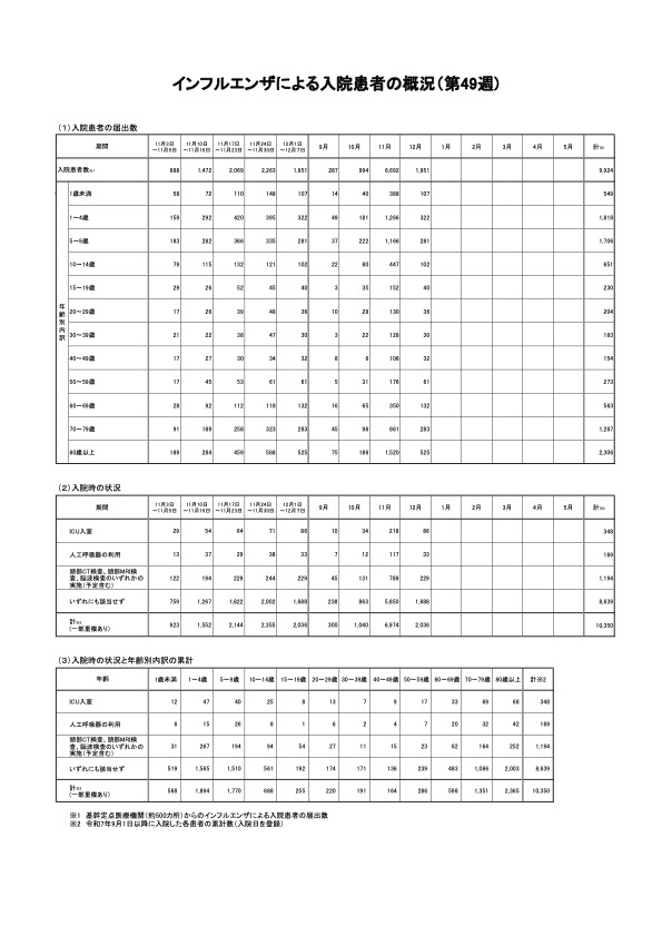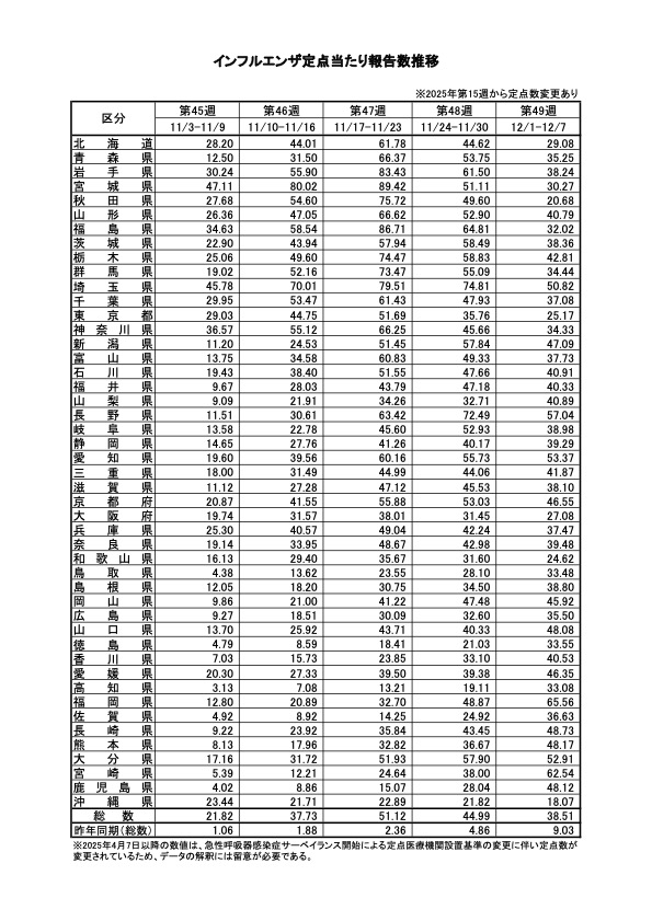 厚生労働省は12月12日、令和7年第49週(令和7年12月1日から令和7年12月7日まで)分のインフルエンザの発生状況を、取りまとめまとめ公表した。